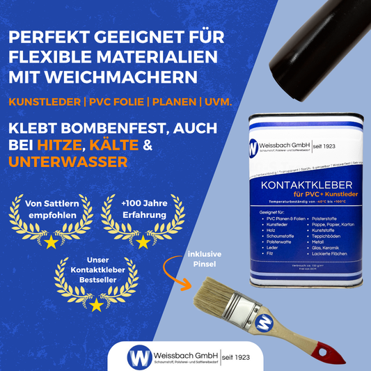 2. Gute Haftung auf verschiedenen Oberflächen: PVC-Klebstoffe haften gut auf vielen verschiedenen Oberflächen wie PVC, Metall oder Holz. Dadurch sind sie vielseitig einsetzbar und können für verschiedene Anwendungen verwendet werden. Besonders unser hauseigener Kontaktkleber für PVC & PU besticht durch seine Vielfalt an zu verklebenden Materialien.