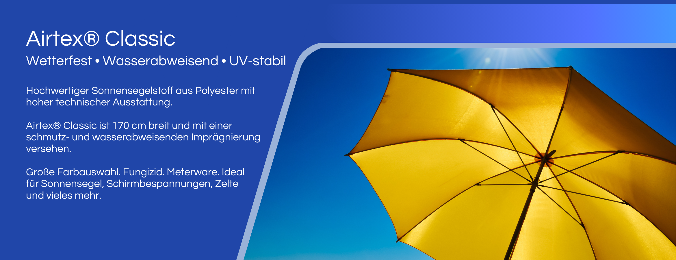 Entdecken Sie die Vielseitigkeit von Airtex® Classic und verleihen Sie Ihren Projekten nicht nur optimalen Sonnenschutz, sondern auch zeitlose Eleganz. Bei uns können Sie Airtex® Classic Meterware kaufen – Ihr zuverlässiger Ansprechpartner für hochwertige Zeltstoffe in Berlin und im Netz. Unser Lager umfasst ständig verfügbare Farben, und auf Anfrage können auch Kollektionen mit kurzen Lieferzeiten bestellt werden. Werfen Sie einen Blick auf unsere Farbkarte für alle verfügbaren Farben und technischen Daten.